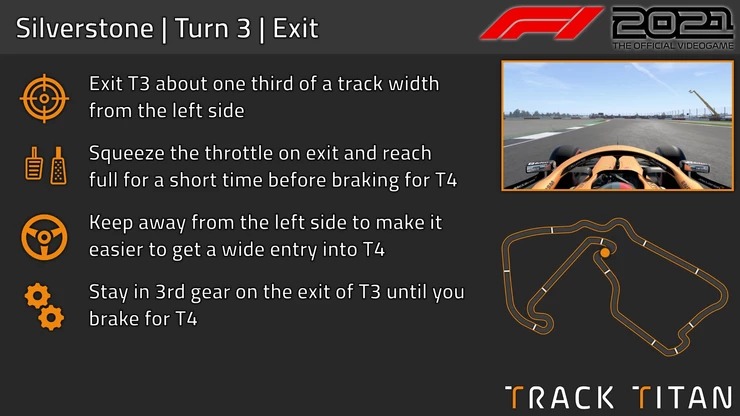 Make sure not to open the steering early so you run out too wide on exit as this will make it harder to get back over to the right for T4, where the exit is much more important. Aim to leave one-third of the track to your left then get most of the way back to the right.