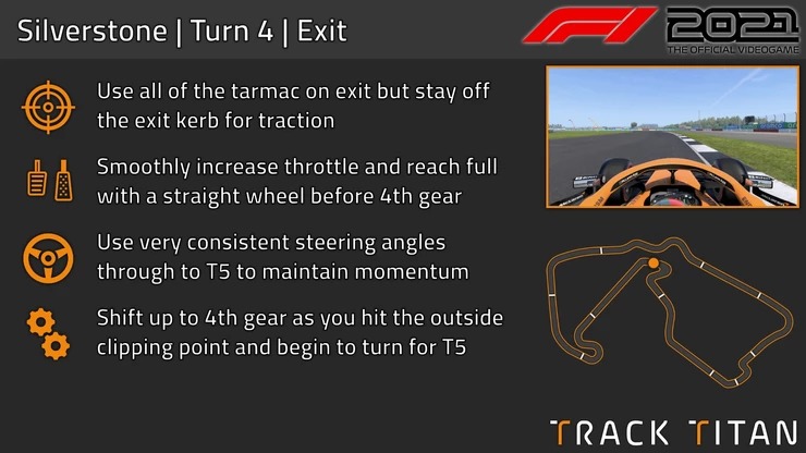 Run the car out towards the exit kerb but keep just off it for traction. Smoothly increase throttle as the wheel straightens to avoid wheelspin in 3rd gear and aim to reach full before shifting into 4th gear, then gently turn into T5. Maintain momentum with smooth steering.